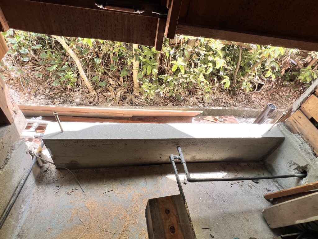 この上に新しく土台と柱を立て、透湿防水シート、ラスカットを使用して外壁の下地を作っていきます。
