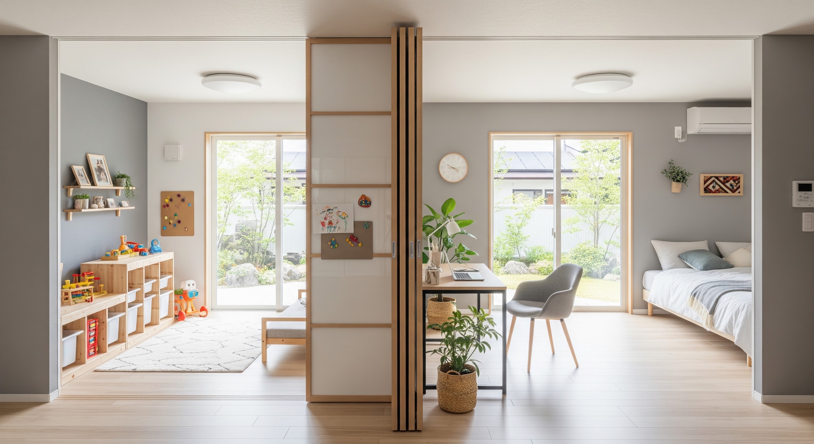 - お客様の求めるもの: 小さいうちは大きなプレイルームとして使い、将来的に仕切って個室にできるフレキシブルな子ども部屋。子どもが独立した後、使わなくなった部屋を書斎や趣味の部屋に変えられる可変性。
