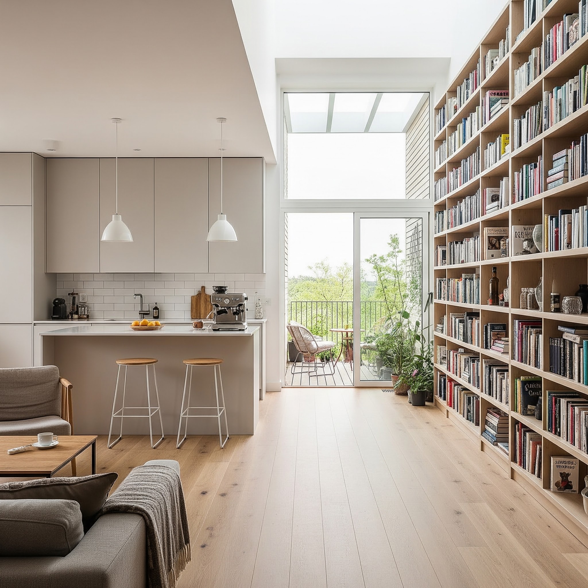 - お客様の求めるもの: 好きなインテリアテイスト(北欧、モダン、ヴィンテージなど)を具現化するための素材選び(無垢材、タイル、塗り壁)。愛読書に囲まれるための壁面本棚、コーヒーを楽しむためのカウンターキッチンなど、「私らしさを表現できる空間」